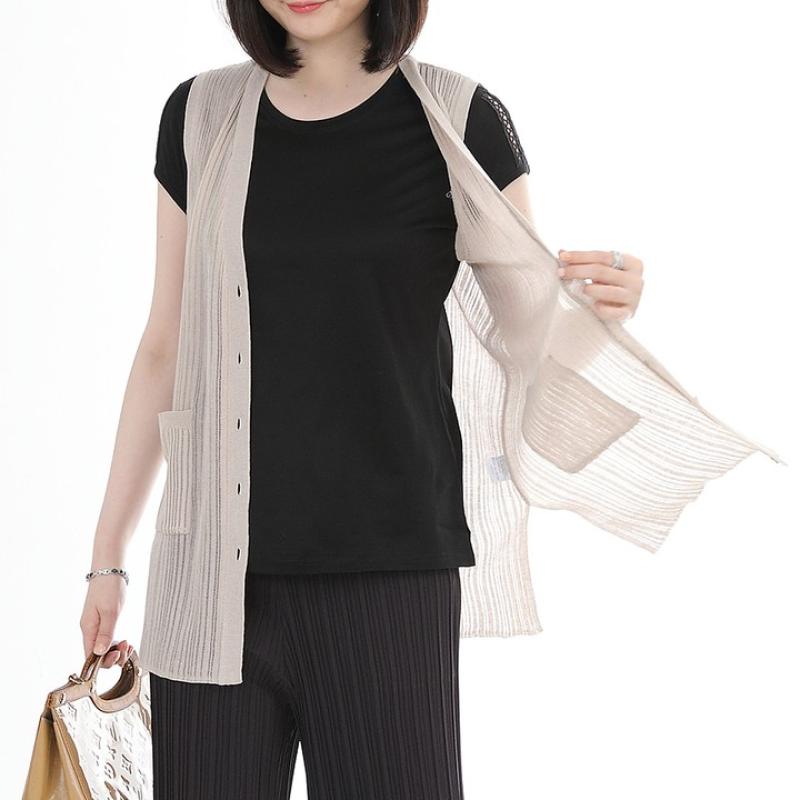 세로줄 시스루 여성 여름 주머니 단추 하프 니트 조끼 V07237