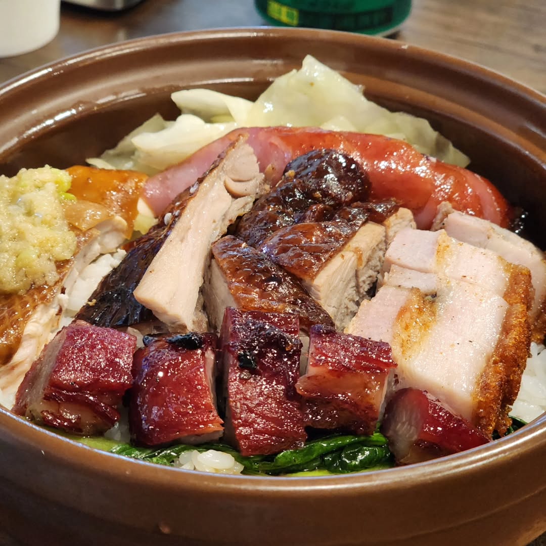 오리와 삼겹살, 대만식 소시지, 닭고기, 그리고 돼지 목살까지! 다섯 가지 고기가 먹음직스럽게 밥 위에 올라가 있었어.